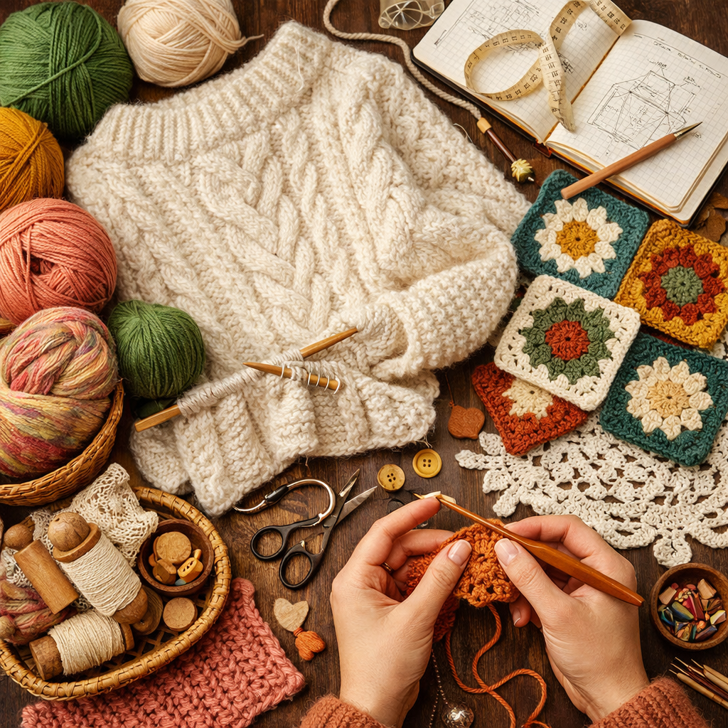 L'artigiana inizia spesso con uno schizzo, uno schema o un campione di prova. Nei lavori a maglia si calcolano punti, misure e tensione; nel crochet si studiano motivi, trafori, aumenti e diminuzioni. Prima ancora di iniziare, c'è già una grande parte di lavoro invisibile.