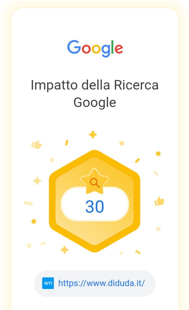 Il badge "Impatto della Ricerca Google: 30" ottenuto su Diduda.it è il frutto di un lavoro costante di ottimizzazione, ascolto e cura dei contenuti. Non è solo un numero: è il riconoscimento di una presenza digitale che funziona, che risponde, che crea connessioni.